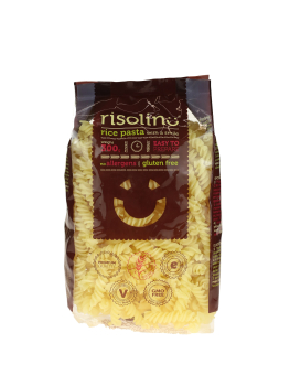 Glutén- és GMO mentes, vegán, tartósítószert nem tartalmazó fusilli rizstészta.