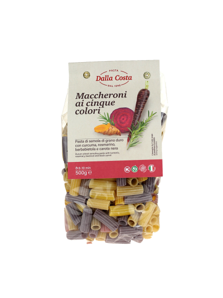 Bronzon húzott, durumbúzalisztből készült, ötszínű olasz maccheroni. Vegán, kóser, adalékanyagmentes termék.
