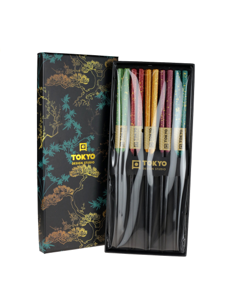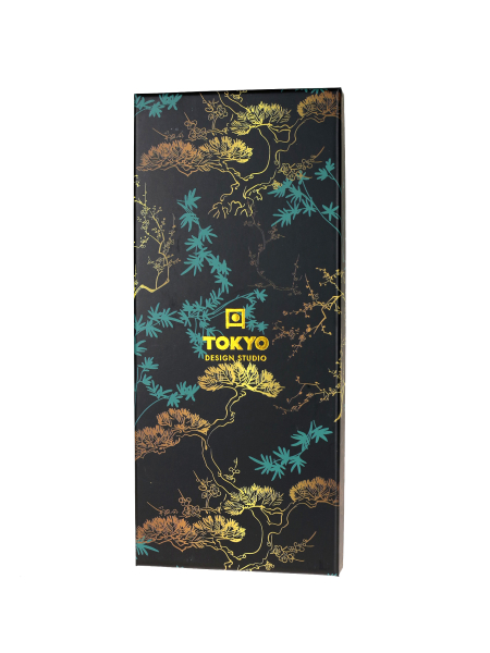 Japán stílusú, hexagon alakú, feketére festett Castanopsis Cuspidata fa evőpálca szett (5 pár) - fenyőmotívumos díszdobozban. 5 féle evőpálca, mindegyik más színű a véggel: metál zöld arannyal, metál bordó arannyal, metál arany arannyal, metál sötét bordó arannyal, metál türkiz arannyal.