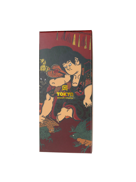 Japán stílusú, barna színűre lakkozott, Castanopsis cuspidata fából készült evőpálca szett (5 pár), bordázott csúccsal - Ukiyoe (a 17. és 19. század között felvirágzó japán művészeti stílus) díszdobozban.